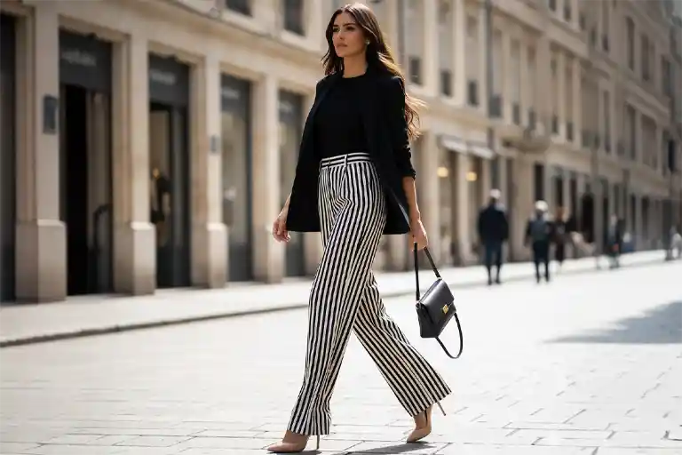 3. Вертикальные линии и узоры. Вертикальные полосы, складки (например, на брюках-плиссе) или даже застежки-молнии, проходящие по всей длине, создают непрерывную линию, которая вытягивает силуэт. Этот трюк отлично работает на брюках, юбках и комбинезонах. И наоборот, горизонтальные линии «разрезают» силуэт, делая его шире и короче.