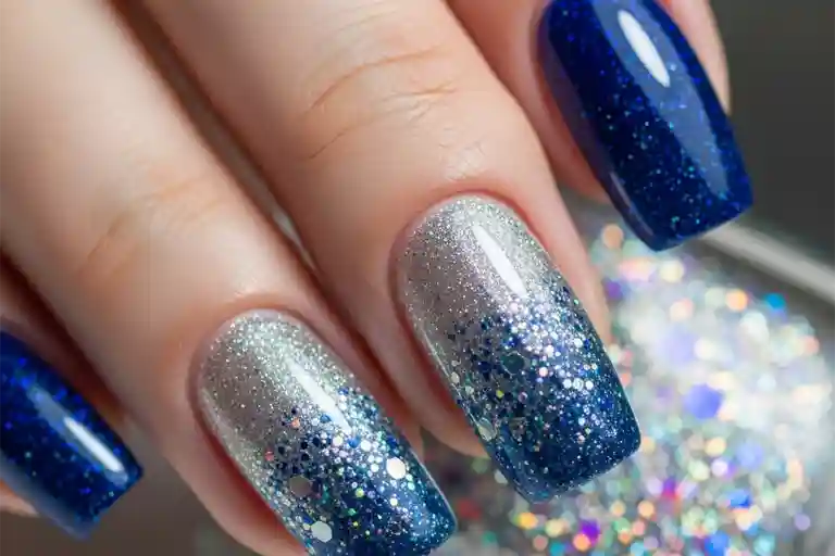 Градиентный маникюр с блестками – отличный выбор для тех, кто хочет добавить немного праздничного настроения. Переход от глубокого синего к серебристому с радужными блестками создаст неповторимый эффект.