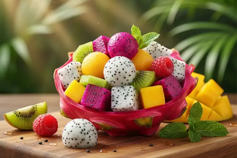 - Подача: Питахайю лучше всего есть охлажденной. Она прекрасно смотрится в фруктовых салатах, смузи, сорбетах и коктейлях. Ее нейтрально-сладкий вкус хорошо сочетается с более яркими фруктами (манго, киви, маракуйя) и даже с некоторыми овощами (огурец). Кожура, благодаря своему эффектному виду, часто используется в качестве натурального декоративного «стаканчика» для подачи фруктового салата или смузи.
