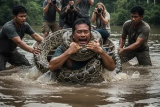 Змея притаилась у берега. Гид, имеющий опыт обращения с рептилиями, решил продемонстрировать свои навыки и схватил питона за голову. Однако тот резко дернулся, сбросил мужчину в воду и обвился вокруг его шеи.