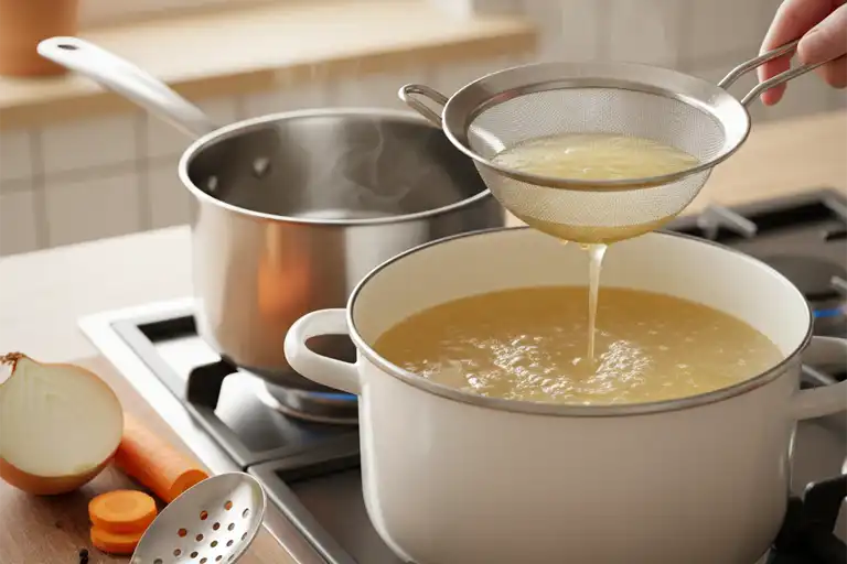- Процедите бульон через мелкое сито или марлю, сложенную в несколько раз, обратно в чистую кастрюлю. Это гарантирует идеальную прозрачность.