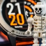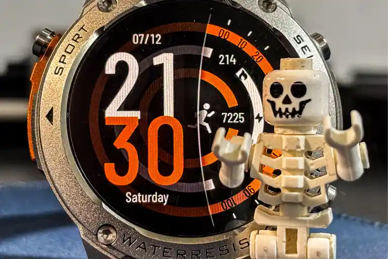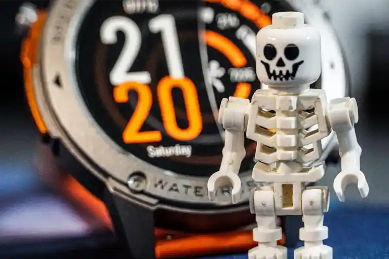 Это же Лего-скелет, да ещё и на фоне крутых умных часов! Выглядит, как будто он пришёл посмотреть, сколько шагов сегодня намотал. Или просто время сверяет. А может, хочет убедиться, что его костлявая жизнь не проходит зря.