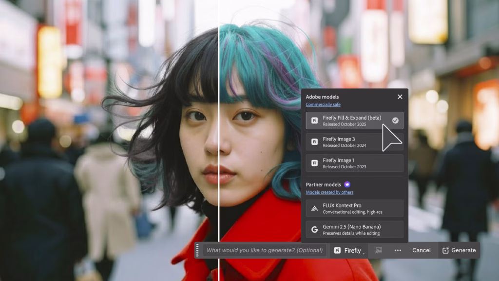 Функция Generative Fill (Генеративное заполнение) теперь предоставляет пользователям возможность выбирать между различными моделями ИИ-партнеров. Это дает больше творческого контроля и потенциально позволяет добиться более разнообразных и качественных результатов. В этом же релизе добавлен новый ИИ-движок Firefly Fill & Expand (beta), который обещает более высокое разрешение и реалистичность при использовании Генеративного заполнения и Генеративного расширения.