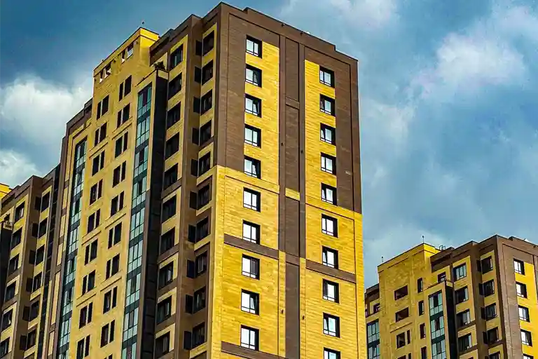 Яркое и динамичное изображение современных жилых комплексов, устремленных в небо.