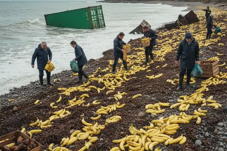 Необычная находка стала последствием аварии грузового судна: в море упало 16 контейнеров, восемь из которых были заполнены бананами, два — плантанами, один — авокадо, а остальные оказались пустыми.